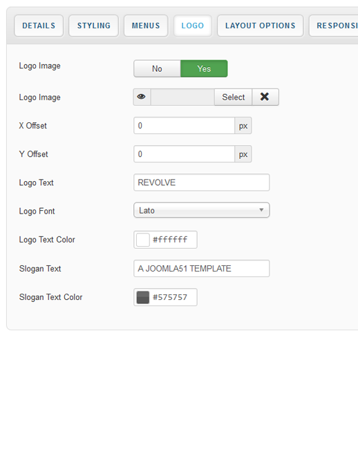 This section of the template parameters allows full control over your site logo with an array of easy to use options. Upload your logo image via the 'Select Logo Image' field and then use the X and Y axis field to tweak its position.