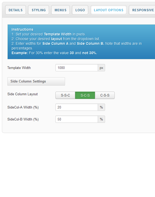 From your Layout Options you can set the layout of your side columns in relation to your site content with options for both your side columns to appear on either the left or the right or on either side of your content/component area. Width options are also available in this tab to edit the entire width of your template.